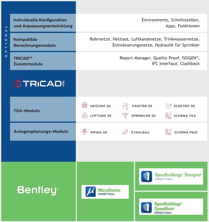 A TRICAD MS az alábbi modulokat kínálja Bentley platformokon: